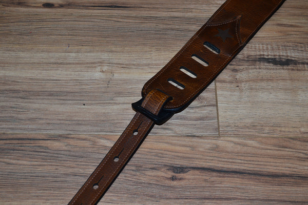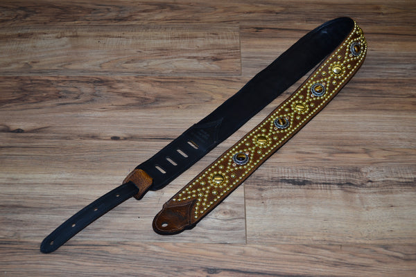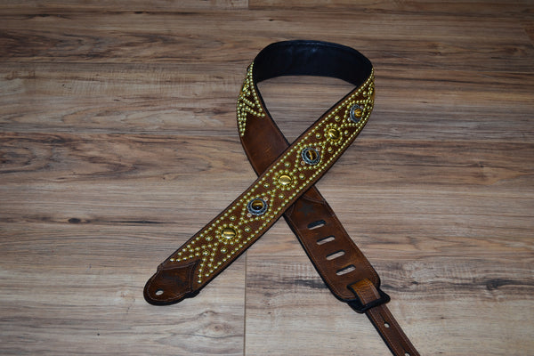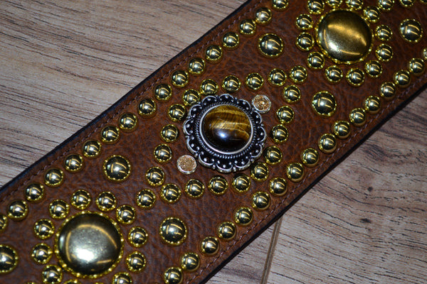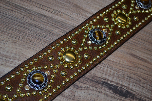 This is really nice, a Brown kodiak oiled leather strap loaded with our new swirl design and has golden Tiger Eye Conchos and goldplated studs with Swarovski Rhinestones as well. It is made from 5oz kodiak oiled brown leather, a black leather smooth backing, full length anti stretch material with full cotton padding and it is adjustable