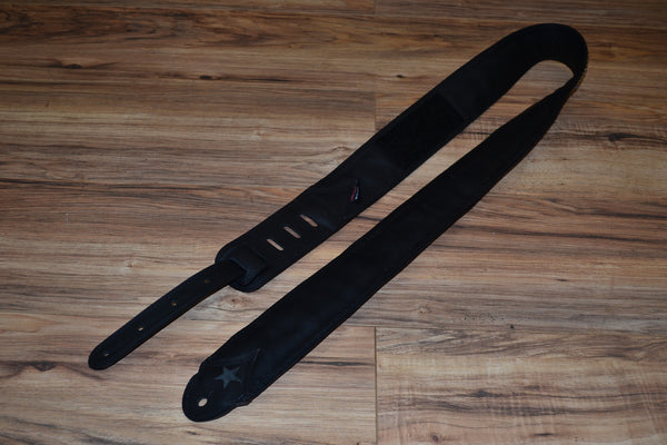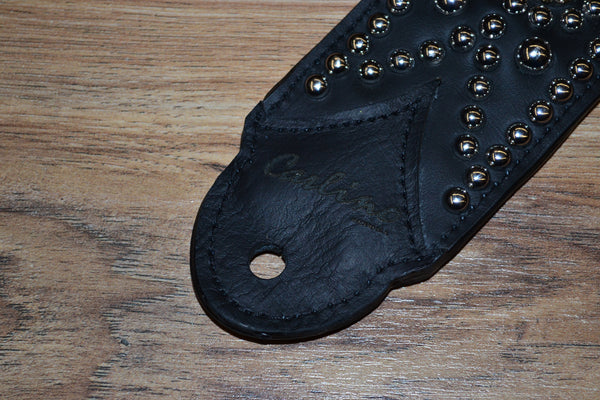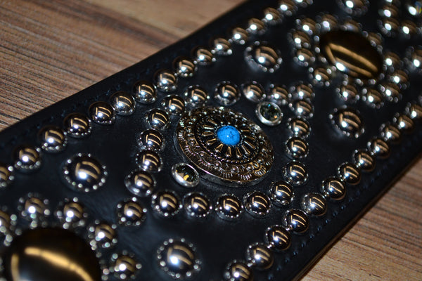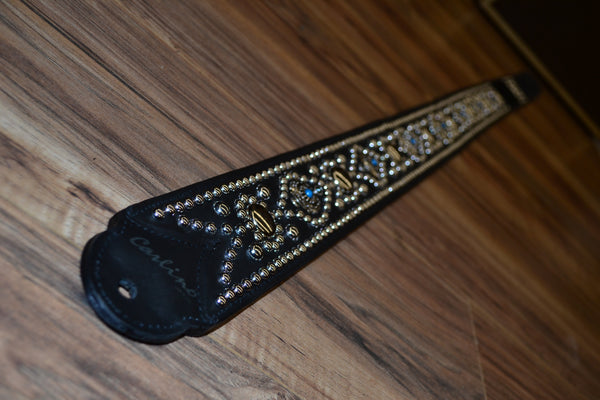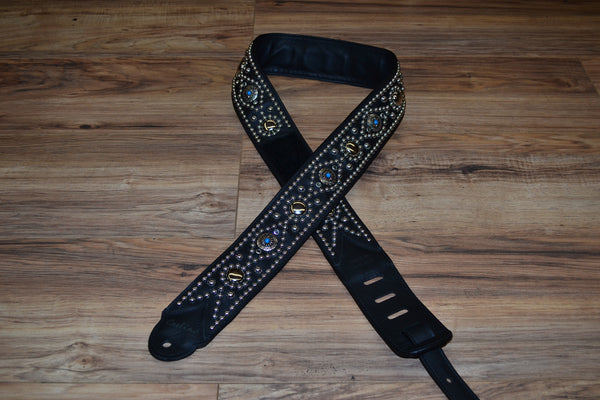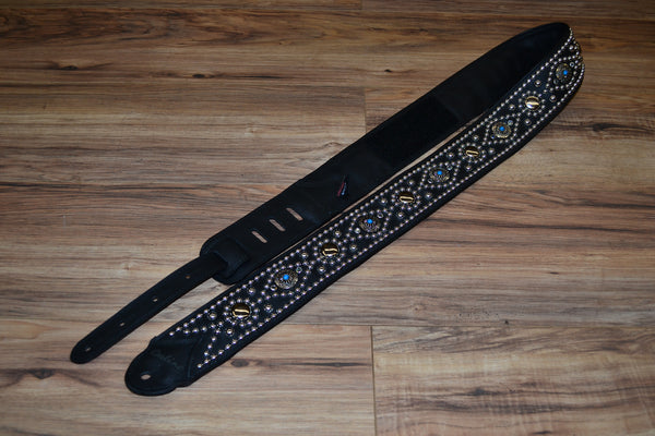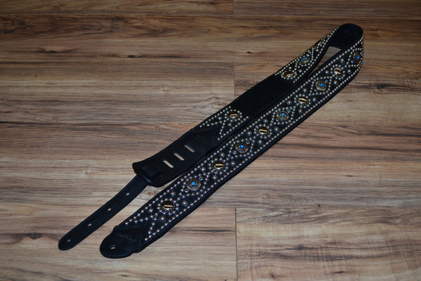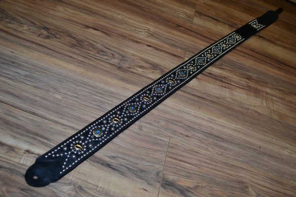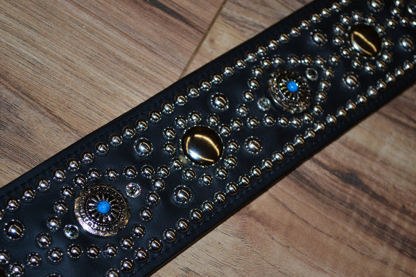This design is a combination design and blends well together and there are so many options you can do, its uncanny . It starts with 5 oz select black leather , a full length anti stretch section, a full length cotton padding and a 4 oz deer tanned leather backing. Then, over 500 nickel plated studs, Swarovski rhinestones, and chrome centered blue stoned conchos are hand set after holes being lassered to perfection. This strap is intense and is all rock and roll or blues. It is adjustable from 55.5" to 60.5" Custom lengths are available