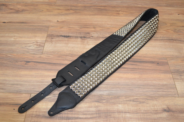 This strap is loaded with 315 Nickel plated 1/2" pyramid studs. There is double cotton padding on it and is made from 5 oz select leather , with a 4 oz garment leather backing and anti stretch material as well. it is 3.00" inches wide and it is adjustable from 52" -57" in length.