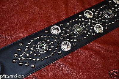 Abalone conchos bordered by 2 Silver Plated Rope conchos on that strap but
