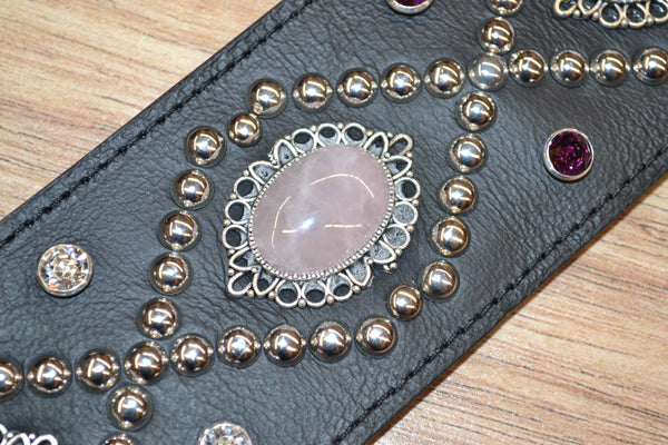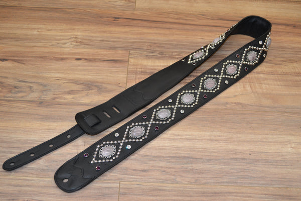 This strap encompasses energy and that what Orianthi wanted in her new strap line. This strap has authentic Rose Quartz center conchos sidelined by Amethyst and Clear Swarovski 34SS Rhinestones and a couple hundred nickel plated studs, 5 oz select black leather with full length cotton padding and a 4 oz Gaucho Garment leather backing. adjustable, 2.55" wide and adjustable to 59"