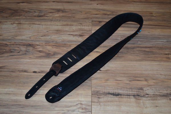 This strap, part of the Orianthi Signature Series is made from Classic Distressed Brown Leather and stabilized Italian Turquoise Center Conchos with aged nickel plate stud design pattern surrounding each one. The backing of the strap is black deer tanned smooth leather. The strap also has an anti stretch center section with a full top cotton comfort padding, with and adjustable length tail from 48-52 longer are available upon request. 10% of each sale goes to the Covid 19 Relief fund in Ori's name