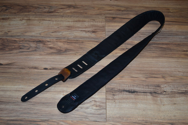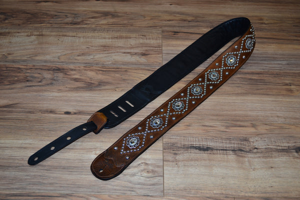 Carlino Custom Orianthi Custom Signature Crystal Guitar Strap, 5 oz select brown leather, with black deer tanned leather back, full length anti stretch material and cotton padding, nickel plated studs and Crystal Conchos, and it is adjustable. 10% of this strap goes to Covid19 relief in her name.