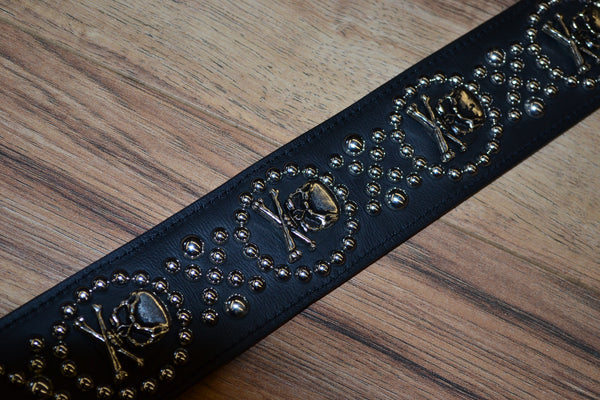 This Carlino Custom Purse/Bag strap is an item we make that others stores carry as well. This is our Prate Concho Model with 3d cast Pirate skulls in a circular studded pattern. 5 oz select leather facing with full length anti stretch material and full cotton padding with a 4 oz deer tanned leather backing. 10 polished nickel and black plated skull conchos are separated by a single abalone concho. Ends have closeable clips that attach to any bag ring rings. 2.25" wide and 45.5" long clip to clip