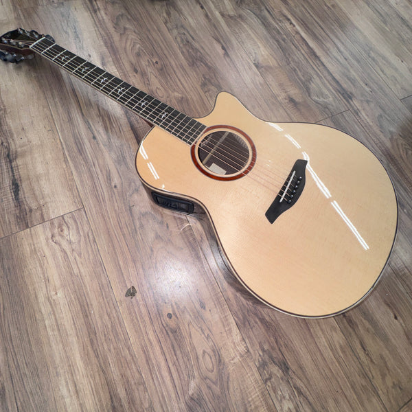 The soundboard of the guitar is protected by a transparent pickguard that allows the natural beauty of the wood to shine through. The pickguard is designed to have no effect on the tonal qualities of the soundboard.