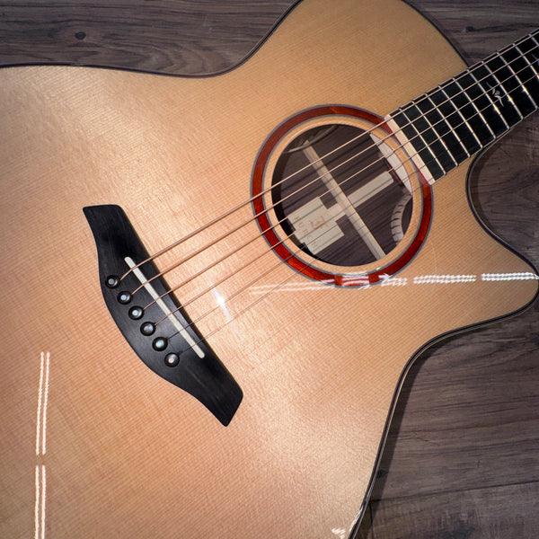 The instrument is protected by our proprietary Full-Pore High-Gloss Finish, which has been developed to enhance the guitar’s tonal qualities. The finish consists of an ultrathin layer of highly resistant lacquer that provides excellent surface protection and accentuates the structure of the wood at the same time.