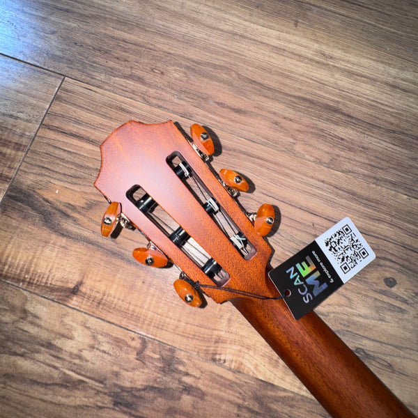 The soundboard of the GNc 4-SR is protected by a transparent pickguard that allows the natural beauty of the wood to shine through. The pickguard is designed to have no effect on the tonal qualities of the soundboard.